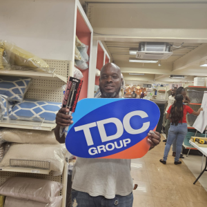 Picture – One of the lucky winners posing with the TDC logo after winning one of the many games at the TDC Home and Building Depot Dad Zone in store activity